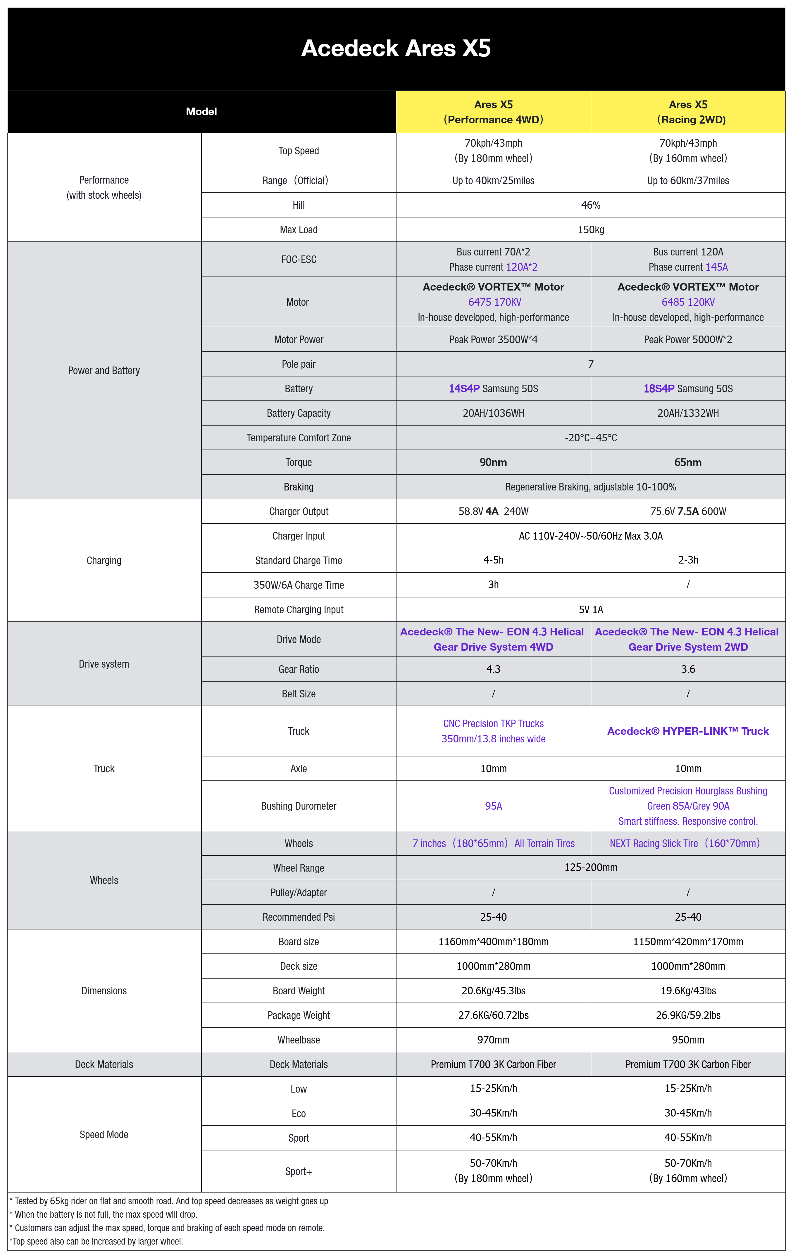 4WD Performance: 14S4P Samsung 50S, Up to 40km/25miles - Up to 70kph/43mph Top Speed