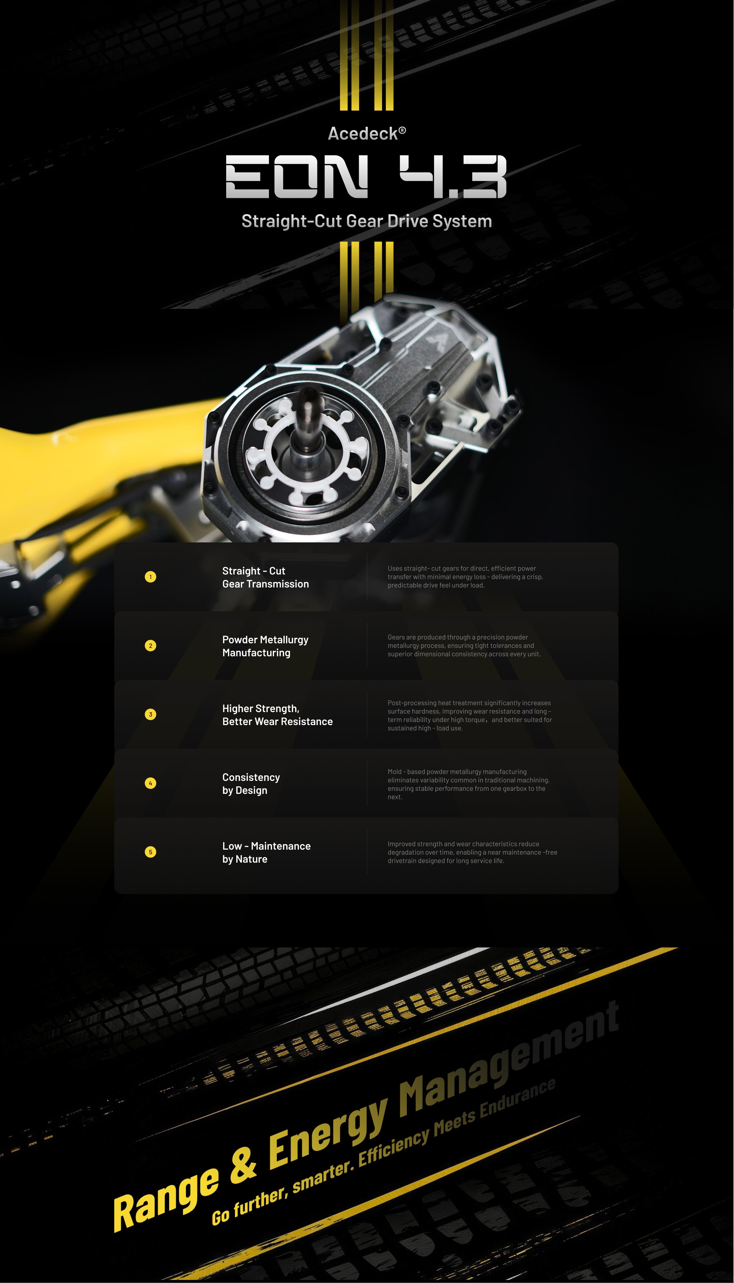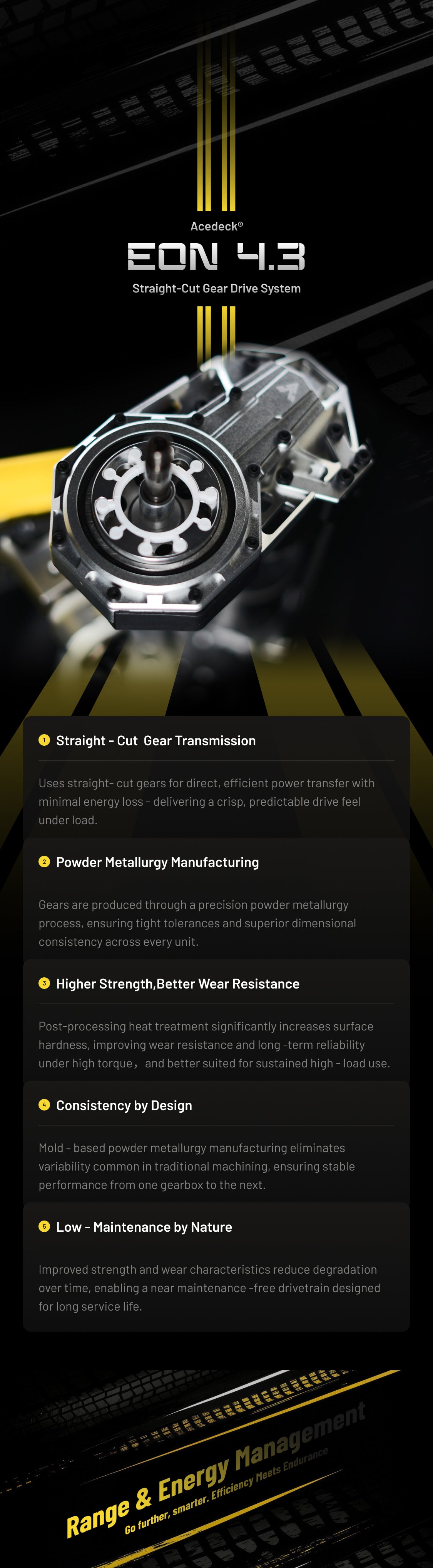 【First-Ever In-House Developed】EON 4.3 Straight-Cut Gear Drive