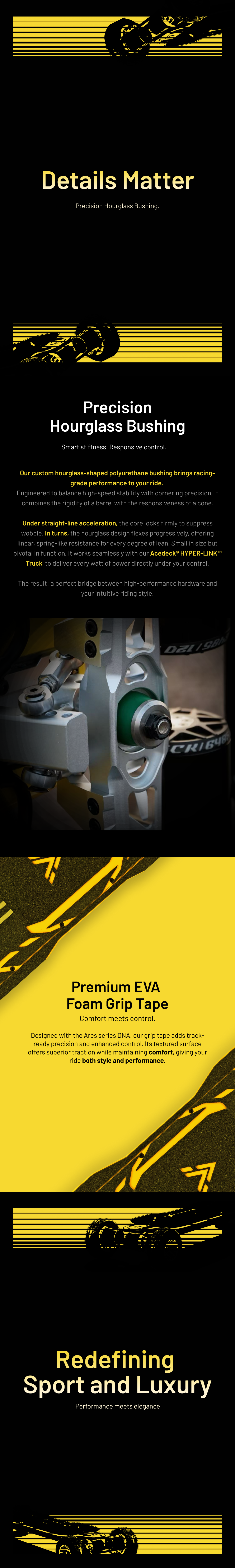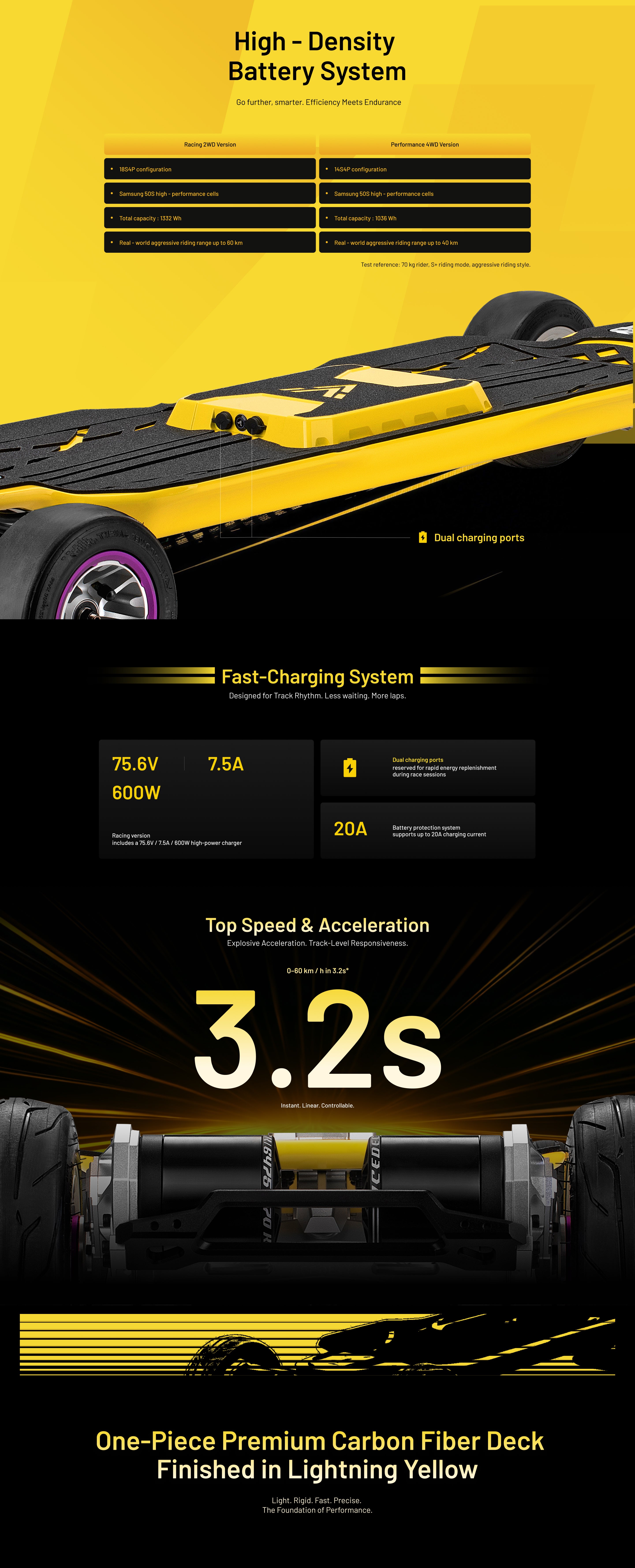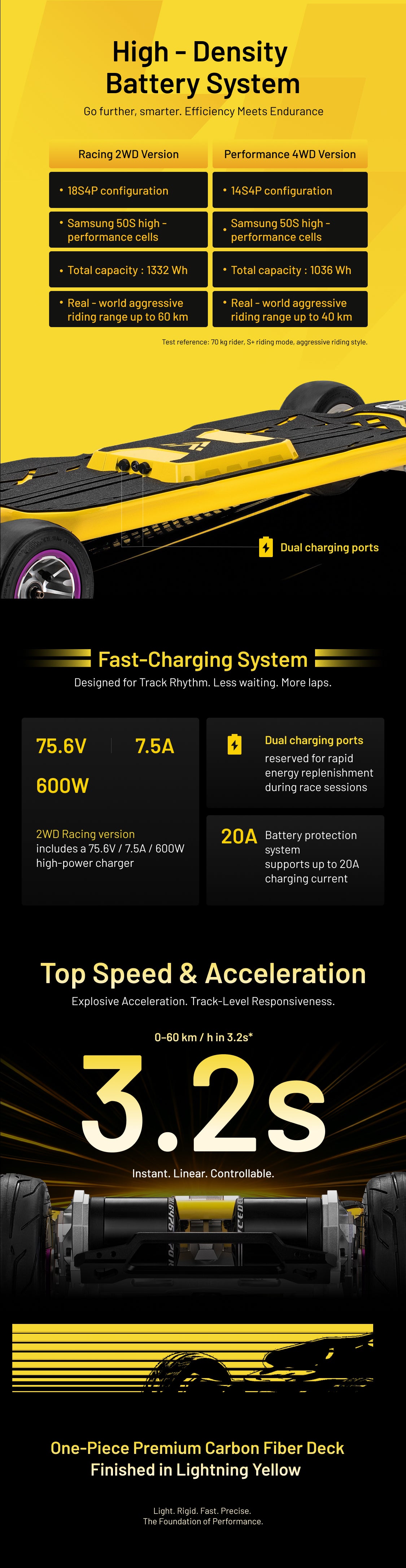 Ultra-rigid Lightning Yellow carbon deck maximizes power transfer and ride precision. -