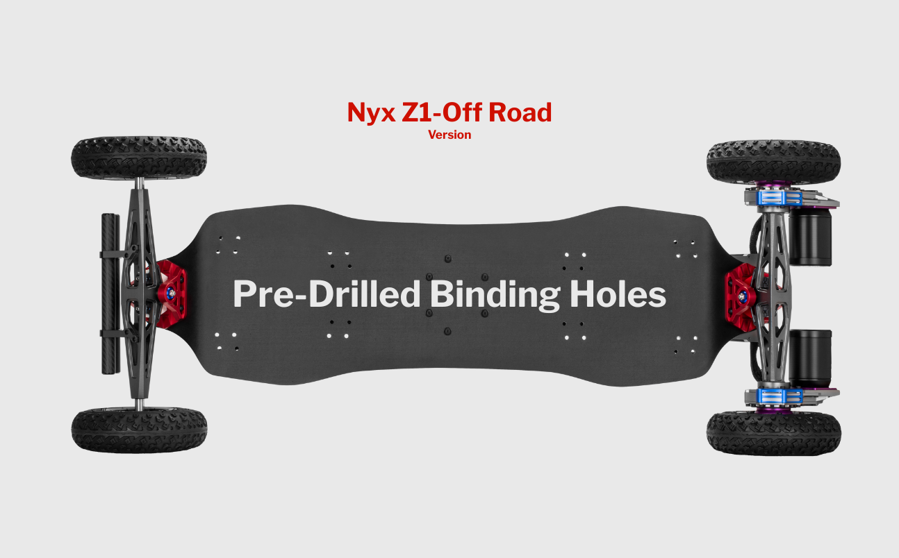 The deck of Z1-Off road version comes with pre-drilled binding holes, allowing you to easily attach bindings for enhanced stability and control. Whether carving sharp turns or tackling rugged trails, this setup gives you a secure, locked-in feel that boosts confidence and precision on every ride.